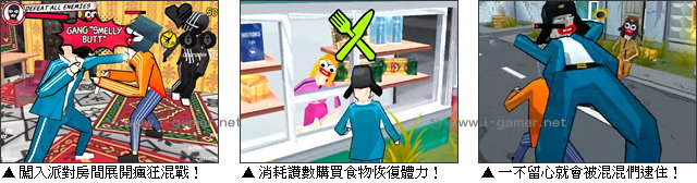 另外,對戰部分,這裡同樣不走傳統套路。除了基本的拳腳,主角還能打出誇張的連段,甚至像電影或《人中之龍》系列那樣,突然來段街舞,施展大風吹直接把敵人掃飛!不過要注意,你的對手也不是省油的燈,看到地面出現紅色軌跡時,可得馬上閃避,否則下一秒倒在地上的,很可能就是主角啦!
