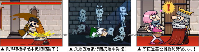 | 遊戲說明: 搞笑逗趣的《刺殺國王》系列推出續作啦,在這次的遊戲中,玩家操控的角色已經覬覦國王的皇冠許久,而背在身後的木槌就是他的武器。現在就試著閃避國王的注意力,抓準時機狠狠的敲下去,並且前往王座吧! 但要注意的是,雖然戴好了皇冠,但想要奪取王位的可不只有你一個呢,隨時提防跟在你身後的王后、小丑、侍女、吟遊詩人或大臣,並且在對方正要下手的那刻回頭,才能以現行犯的身分,喚來侍衛將他們通通扔進地牢唷。多樣化的角色,豐富的結局,你的國王生涯會以什麼模樣結束呢?現在就來體驗一下吧! 遊戲操作:以滑鼠操作進行遊戲,點擊左鍵刺殺國王或發現刺殺者。