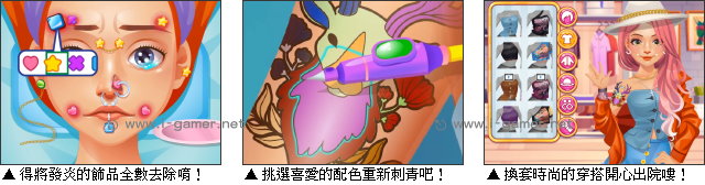 遊戲說明: 熱愛搖滾的女孩來到診所時,狀態看起來有點糟糕,不只穿洞的部位都發炎腫脹,連刺青也都褪色長泡!不過別擔心,只要正常發揮,身為醫生的你,就可以讓她重獲笑容啦!首先,讓我們把引起感染的飾品拆除,再使用棉棒、酒精清創。記得,擠出膿泡後可別忘了消毒再敷藥。  而針對冒著奇怪氣泡的老刺青,玩家還得抽取膿液、配製專屬藥物讓女孩服下,並在手臂痊癒後,選擇新圖案和配色,幫她重新展現風格唷!究竟最後,女孩會以什麼模樣踏出診所呢?讓我們好好期待一下吧! 遊戲操作:以滑鼠操作進行遊戲,左鍵點選道具進行治療、裝扮女孩。
