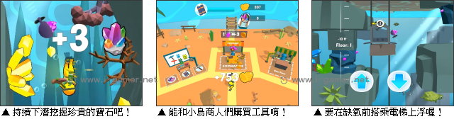想要更加省力嗎?那就花點現金解鎖電梯,下次再出發,玩家就能一秒抵達深海區。另外,有時你還會遇到悠游的海龜,此時可以在牠們驚嚇裝昏時取走殼上的寶石唷!每座島嶼的礦藏都不同,風格也有變化……不過別忘了,氧氣有限,記得抓準時機浮上海面,才不會功虧一簣喔!這場關於寶石與冒險的海底之旅,就等你來親自挖掘啦!