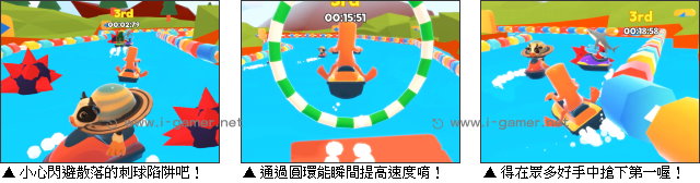 這一路上玩家除了得努力閃避會讓人暈頭轉向的漂浮刺球,還要搶在其他小怪之前通過空中圓環,才能大幅提升速度唷!另外,為了奪下冠軍,玩家需要順利跑完三圈,並在最終擊敗其餘三名對手通過終點才行!現在就和你最喜歡的木棒人一塊,飛馳在這場充滿謎因能量的水道上吧!