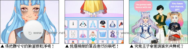 遊戲說明: 在這座特別的城市裡,每個女孩都懷抱著一個夢想——成為全場最亮眼的明星,和王子共舞!而身為專業造型師的你,今天也同樣迎來了這樣的女孩。不過和其他人不太一樣,她可是原本高高在上,卻因為差勁的生活習慣弄得亂糟糟,被王子踢出皇宮的公主。  為了拯救她,你需要先拿出神奇擦臉布,讓女孩恢復原本的美貌。接著,從最夯的幾種打扮中挑選,看是要變身禰豆子還是初音,都能自由選擇唷!最後也別忘了化妝和運用各種飾品製造亮點,讓她顯得更加迷人喔!究竟在你的巧手改造下,女孩是否能奪回原本的舞伴之位呢?讓我們拭目以待吧! 遊戲操作:以滑鼠操作進行遊戲,左鍵點擊化妝品、服裝、飾品裝扮女孩。