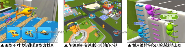 遊戲說明: 面對變化萬千的地形,玩家能否順利穿越重重障礙,在一眾對手之中抱回冠軍獎盃呢?風格可愛又搞怪的《變身狂奔》是一款快節奏的變形競速遊戲。玩家在其中需要掌握時機,隨時變身成汽車、直升機、帆船、滑翔翼、雪地車等等不同的載具。不過這可不是單純的換皮唷!  每種交通工具都有特有的優勢。例如面對獨木橋時就得切換成腳踏車通過,遇到高聳石牆就要變成直升機才能爬升飛越。而在這之中,如果玩家的思考停滯,手速過慢,很可能下一秒就會被難纏的對手給追過啦!另外,除了變身玩法,遊戲還加入了建設元素。  玩家在比賽後將前往一座美麗的小鎮,你不僅可以用比賽獲得的獎金購置甜甜圈、冰淇淋店賺取額外的收入,還能解鎖修車行,為你的各項載具升級速度,讓它在賽事中表現得更加出色,拉大和對手的差距唷!準備好來一場熱血沸騰的奔跑了嗎?現在就動動手指,好好暖身一下,主角變形的速度與準確性,將是你通往勝利的關鍵唷!GO! 遊戲操作:以滑鼠操作進行遊戲,左鍵點擊載具圖案變身。