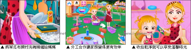 從先擠上洗碗精再用菜瓜布刷乾淨碗盤,到將撒得到處都是的玩具歸類、鋪床,以及把散落的衣物放進洗衣機,再晾乾。別看小寶貝個子矮,做起事情可是超級俐落呢!而等到完成一系列任務後,媽媽也會準備美味的下午茶,和小寶貝一起共度溫馨時光唷!現在就開始動手做吧! 遊戲操作:以滑鼠操作進行遊戲,左鍵使用道具做家務。