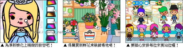 另外,就算到了婚禮當天也還不能放鬆喔!畢竟當天賓客眾多,每個人的位置都有講究,你需要一一安排,才能拍出最棒的照片,讓新人們留下美好的記憶呢!現在就來欣賞最終的結果吧! 遊戲操作:以滑鼠操作進行遊戲,左鍵點擊道具裝扮新人、布置會場。