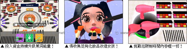 | 遊戲說明: 在這款超酷的《彩妝黑洞大變身》遊戲中,玩家將控制神奇黑洞,把散落的化妝品通通吸進去,以幫女孩完成最華麗的變身。眼影、腮紅、口紅,每一樣都是必備的產品,收集越多,妝容就越完整。 遊戲玩法很簡單,但想要讓女孩滿意可不輕鬆,需要一點策略才行。你得判斷路線,精準吞下尺寸合適的化妝品,才能讓黑洞愈加茁壯,吞下更加巨大的工具。而隨著關卡推進,玩家手邊的資金也會逐漸累積起來,此時便能提前升級黑洞,讓它在開局時就快速清盤唷!喜歡改造和收集遊戲的你,快來體驗彩妝黑洞的魔法吧!  遊戲操作:以鍵盤 WASD 鍵或方向鍵或滑鼠拖曳操控黑洞移動。