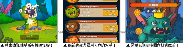 | 遊戲說明: 在這款融合放置和角色扮演的《點擊英雄:怪物獵戰》遊戲中,玩家只要動動你的手指,瘋狂點擊,就能對怪物造成傷害並且獲得金幣嘍!不過,這可不只是單純的點到爆遊戲,手邊資源要用來升級主角本身的戰力,聘請可靠的傭兵助陣,還是購入藥水獲得短時間增益,都由你自由決定喔! 在開始,玩家只能使用劍士和法師兩個角色進行冒險,第三位隱藏英雄則得完成50級關卡才能解鎖。但無論是哪位,除了自身,只有將隊伍盡可能壯大,提升整體戰鬥力,才能打倒蜂擁而來的怪物。尤其面對魔王級角色,想要慢慢磨可是不行的!若沒在指定秒數內擊殺,就只能下次再來嘍!現在就來組建你的傳奇軍團,成為最強怪物獵人吧!  遊戲操作:以滑鼠操作進行遊戲,左鍵點擊進行攻擊。