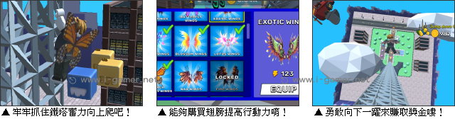 | 遊戲說明: 準備好化身勇敢的冒險者,挑戰雲端之上的高塔極限了嗎?在遊戲中,玩家不僅需要抓緊鐵塔,一步一步往上爬,還得利用信仰之躍,平安墜地來收穫鉅額獎金。 至於這些獎金可以做些什麼,除了用來購買各種華麗的翅膀,提升攀爬速度,還能打開寵物扭蛋,收穫不同種類的小可愛作伴,讓牠們在爬塔時提供額外加成。 另外,除了玩家本人,場地還有其他挑戰者,大家同時開爬,是不是感覺會更有幹勁呢!至於順利登到塔頂可以做些什麼?就等待玩家自行去挖掘啦!你能成為傳說中的攀塔飛人嗎?  遊戲操作:以鍵盤 WASD 鍵或方向鍵操控角色移動,空白鍵跳躍,滑鼠右鍵拖曳調整視角。