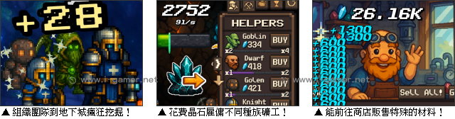 | 遊戲說明: 在這款像素風的《鑿礦挖寶小隊》點擊遊戲中,玩家需要帶領一支種族大融合的礦工小隊,不停敲擊礦石,直到閃閃發亮的水晶再次現世!聽起來簡單?那可不一定唷!因為每開一個新礦洞,材質就會變得更堅硬,只有不斷升級、擴編、合成,才能突破重重障礙,成為真正的礦工之王。 一開始,玩家只能依靠自己揮舞十字鎬,慢慢敲碎岩石,累積第一批晶石。這些晶石能用來雇傭可靠的夥伴,從笨拙的哥布林,到力大無窮的巨人,甚至還有呆愣的石頭怪、墮落的戰士,或是遠古的克蘇魯——每個角色都有自己的特性與採掘效率。 但要注意,每個礦區一次只能配置十名工人。如果位置滿了,玩家可以選擇讓相同角色合併,進階成更強的版本,也能直接解僱效率較低的成員,釋出空間給新夥伴。另外,在挖掘過程中,玩家還可能會隨機炸出珍貴的結晶。這些寶物可以前往商店販售,獲得更多晶石。  而之前提到的水晶,則是拿來啟動各種加速器的好東西,舉凡提升挖掘速度、自動挖掘等等,都可以讓你玩起來更輕鬆唷!你準備好體驗從孤身一人揮鎬出發,到後期率領十名、百名礦工全力開挖,那份從零開始、越挖越快的爽感了嗎?現在就動動手指,揮下第一鎬吧!  遊戲操作:以滑鼠操作進行遊戲,左鍵點擊挖掘、雇傭礦工。