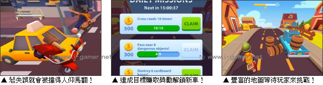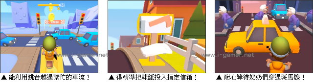 | 遊戲說明: 在《奔跑吧!報童》遊戲中,玩家需要挑戰速度、技巧與反應力的極限!你將化身活力滿滿的報童,騎著滑板或機車穿梭在城市街道之間,一邊送報、一邊閃避車潮,用驚人的手速與準確度,把報紙投進每一個信箱! 城市生活節奏總是超乎想像的快,街上人潮、汽車川流不息,玩家不僅需要遵循交通規則,仔細確認燈號,在狹窄小巷滑行時,也得留意呼嘯而過的火車,或是發揮耐心等待走路慢得像烏龜的老奶奶們,才能不出差錯,使命必達唷! 另外,隨著玩家通過一次次考驗,地圖也會從擁擠的市中心主題,來到鄉村風滿滿的小鎮,以及下著雪,布置了各種節慶裝飾的冬季社區。而因應著這些改變,登場的障礙物也會有所不同,遊戲性可以說是相當豐富唷!  除了努力派報,完成每個關卡的要求外,遊戲還設有每日任務,玩家只要完成連續擊中幾個障礙紙箱、派發幾份報紙這類目標,就可以獲得額外獎勵,像是大筆的資金,又或者是全新的角色、新車等等。喜歡跑酷遊戲的你可千萬別錯過嘍!現在就戴上安全帽、裝上報紙,在城市的節奏中疾馳吧——下一位傳奇報童,就是你啦!  遊戲操作:以鍵盤 WASD 鍵或方向鍵或滑鼠拖曳操控主角移動。