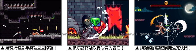 | 遊戲說明: 在這款復古風格的像素動作遊戲《暗夜忍者傳》中,玩家將化身身手矯健的忍者,在黑夜之中穿梭。你需要發揮百分百的反應力,在最短時間做出判斷,看是要跳躍、翻身還是閃避,才能通過重重障礙。 不過這遊戲可不只是平台跳跳樂,路上還會出現包含武士、女鬼等各有特色的敵人來干擾玩家前進的節奏。你需要搶先一步揮舞手上的利刃,或是在遠處投擲苦無,來安全的解決掉難纏對手。不過面對在深處盤踞的惡魔,玩家就不能輕鬆看待了,你需要運用前面累積的所有技巧,展開一場硬碰硬的生死決鬥!準備好踏入暗夜,展開你的忍者試煉了嗎?  遊戲操作:以鍵盤 A、D 或 ←、→ 鍵移動,空白鍵、↑ 鍵跳躍,Shift 鍵加速,L 鍵或滑鼠左鍵攻擊,K 鍵或右鍵投擲苦無。