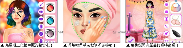 | 遊戲說明: 為了展現自己也能征服不同的風格,總是一身黑漆漆的星期三,這次可是豁出去啦!首先,她不僅帥氣的剪短了留了許久的長髮,並且將它們用電捲棒燙得更加有線條,甚至還進行漂髮,以讓繽紛的色彩可以染上這一頭捲髮! 接著,她細心的保養了一下這幾天因為熬夜變得暗沉的臉蛋,再挑選繽紛的彩妝品,讓五官被點綴得更加亮眼。最後再打開塞得滿滿的衣櫃,看看有沒有哪些衣服是平常看起來閃瞎眼,但現在卻十分合適的。究竟我們的星期三會以什麼模樣回到校園呢?現在就來期待一下吧!  遊戲操作:以滑鼠操作進行遊戲,點擊服裝、髮型、化妝品裝扮星期三。