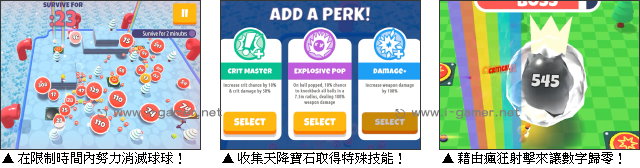 | 遊戲說明: 在這款超可愛的快節奏射擊遊戲《彈球獵手》中,玩家需要在小小的競技場中,對付滿場亂竄的搗蛋球球!每顆球都有自己的數字血量,玩家得靠瘋狂連射來讓數字歸零,才能成功將它們擊破。在每局開始時,玩家要迅速確認環境,調整走位才能躲避球球的推擠和攻勢。 而在過程中還會有從天而降的寶石。玩家只要撿起就能獲得各種強化技能——像是自動輸出的砲台、滿天的子彈雨,又或者是提高子彈速度、射速、攻擊力的增益效果。另外,每個等級都有不同的勝利條件,有時是倖存者模式,有時則指定消滅球球數量等等,玩法變化相當多元喔!準備好讓球球知道誰才是場上最猛的獵手了嗎?  遊戲操作:以鍵盤 WASD 鍵或方向鍵操控角色移動。(自動射擊)
