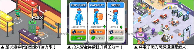 | 遊戲說明: 準備好化身科技巨頭,打造屬於你的夢幻電器王國了嗎?在經營遊戲《模擬電子商場》中,玩家可不會只屈居一間小店,在發揮縝密的投資眼光之後,你將掌握整條街的節奏,吃下所有的市場。 在遊戲初期,玩家將親力親為,處理這間P果專賣店。你需要將倉庫裡新到貨的手機和平板一台台放上貨架,等待路人上門體驗。而面對終於下定決心,打開他們錢包的顧客,則要發揮巧手細心包裝,製造滿滿尊榮感,快速回收資金唷! 另外,看到寫著特定金額的封印區域了嗎?投入對應資金,玩家除了可以擴大販售種類,放置包含智慧手表、筆電在內的貨架,還能解鎖體驗中心、維修中心,以及最重要的人事部門唷!  是的,都成為老闆了,如果還是單打獨鬥,這工作效率可上不來呀!玩家需要雇傭可靠的收銀員以及更多的鋪貨員、維修工等等,才能提供顧客最棒最全面的服務。而等到玩家順利解鎖所有神秘框框,下間店的大門就會向你敞開啦!  此時玩家將可以經營T斯拉、N天堂等不同面向的商鋪,並且體驗因為商品種類,大不相同的店內擺設,甚至還會新增VR區或是試駕專區,玩起來可說是樂趣滿滿喔!現在就來挑戰讓你的商場成為科技潮人的聚集地吧! 遊戲操作:以鍵盤 WASD 鍵或方向鍵或滑鼠拖曳操控主角移動。