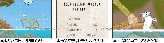 而隨著玩家順利在地圖上的小島之間移動,難度也會悄悄升級。不只是海流、風向,甚至地形也會對竹筏造成麻煩!玩家需要一次次嘗試,一次次微調,才能實現山羊的渡海夢想喔!現在就來激盪一下你的大腦吧!