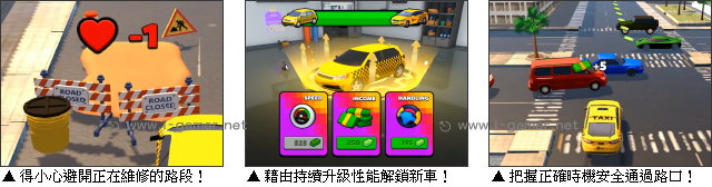 | 遊戲說明: 在《狂飆計程車》遊戲中,玩家將化身為了搶佔通勤尖峰時段生意,堪稱拼命三郎的小黃司機。你得在極限提速和遵守規則之間取得平衡,讓那些嚷嚷著趕時間的顧客可以順利且安全的抵達目的地,來讓荷包賺得滿滿! 不過也不是什麼客人玩家都要接,你可以自由選擇要在哪張地圖接下哪張單。每位客人的需求和報價都不同,有的急、有的則想要一趟安穩舒服的旅程。但如果因為技術不佳,擦撞太多,可憐的乘客很可能會嚇到半路跳車,留下一顆星的大負評! 所以玩家需要發揮你的反應力,精準踩點、滑順轉向,抓準空檔通過十字路口——沒有紅綠燈的那種,才能一路暢通喔!遊戲的操作方式相當簡單,長按踩油門、放開煞停、左右切換車道。但等到速度上來,玩家就會發現事情沒想像中單純啦!  另外,遊戲中還有設置了升級系統,玩家除了可以把資金投入到提升汽車性能,還能享受到提升一定程度後,生財工具瞬間變身成更加帥氣的新款唷!準備好載上下一位乘客了嗎?系統已經幫你亮燈啦,現在就出發吧!畢竟前一秒可能還在慶幸車道空蕩蕩,下一秒就會遇到施工路段,甚至還有莫名其妙的停車格登場,稍不注意就會發生擦撞。  遊戲操作:以鍵盤 W、A、D 鍵或滑鼠左右拖曳操控計程車行駛。