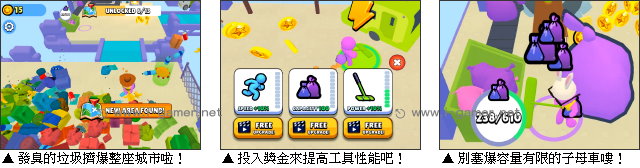 | 遊戲說明: 糟糕!城市的垃圾處理系統全面停擺,到處堆著散發臭味的垃圾山!看著子母車被塞滿,缺乏公德心的傢伙甚至直接往地上亂丟。而你,就是那位臨危受命的清潔英雄,拿著迷你吸塵器四處吸吸吸,努力讓城市的環境復甦。 但這差事也沒看起來糟糕!玩家每丟掉一些垃圾,就能獲得對應的金幣。你除了可以用來升級工具性能,讓吸力越來越強、容量越來越大,讓清潔流程變得更加順暢,也能解鎖通往其他區域的通道,解決不同地方人們的困擾。 不過遊戲可不只是單純把垃圾吸掉,其中還有回收玩法。挑出垃圾中的鐵鋁罐、紙箱、果皮等可回收物,送進不同的機器進行分解與再製,就能把紙箱變成玩具、果皮變成精緻盆栽,再用更高的價格販售出去喔!  另外,為了喜歡裝扮的你,地圖中也散落著各式各樣的配件,玩家可以讓角色戴上兔兔帽、帥氣墨鏡,變得更加時尚呢!現在就打開這款集結開發、模擬、環保元素的《瘋狂清潔隊》遊戲,用吸塵器,好好拯救城市風景吧!  遊戲操作:以鍵盤 WASD 鍵或方向鍵或滑鼠拖曳操控主角移動。