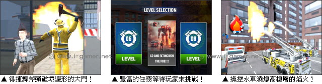 例如面對高樓層的火災,玩家就需要架起雲梯車,操控水管上下左右,努力澆滅火苗。而面對有人受困的情況,則要大力揮舞斧頭,試著破開已經變形的大門,並且利用手持滅火器,在保證自己安全情況下,近距離處理。