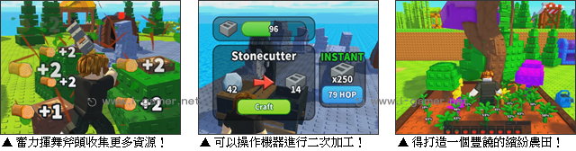 這裡沒有煩人的規則,更不用聽誰在那指手畫腳,你的想像力就是唯一的生存準則。既然要當島主,當然少不了整地、農耕與貿易的樂趣!玩家首要任務得先揮舞斧頭砍伐樹木、敲碎岩石,收集大量的材料解鎖仍被封印的區域。