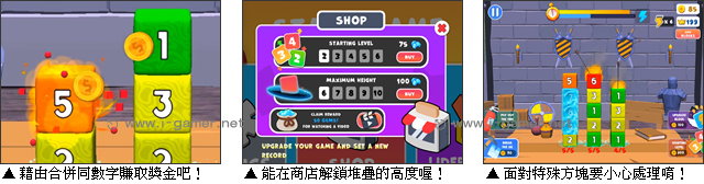 只要其中一柱超過限制,挑戰就會立刻結束,沒有任何反悔的空間唷!為了減少場上的方塊,玩家需要藉由來回搬動,使相同數字的能堆疊在一起觸發合併。不過,場上也不只有乖乖等你合併的普通方塊。當出現冒著火焰或是寒冰的造型方塊時,就會觸發特殊情況,玩家得更加小心啦!