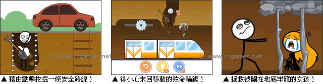 | 遊戲說明: 超愛搞事的火柴人又來啦!這次,玩家將見識到最崩壞、最無厘頭的逃生邏輯。身為專業的挖掘工,玩家的任務看似簡單,就是動動手指挖出一條路,讓火柴人完成目標——它有可能是逃出監獄,也或者是找到珍貴寶藏,又或者是拯救被關起來的美麗女孩。  但可別高興得太早,這軟呼呼的泥土裝滿了開發者的惡意!你得小心避開那些來回移動,想要把人切成碎片的輪鋸,以及正緩緩流動的炙熱岩漿,才不會用最搞笑的姿態被送上西天唷!究竟玩家會是傳說中的救世主,還是專門來搞破壞的地底殺手呢? 遊戲操作:以滑鼠操作進行遊戲,長按左鍵拖曳挖出安全路徑。