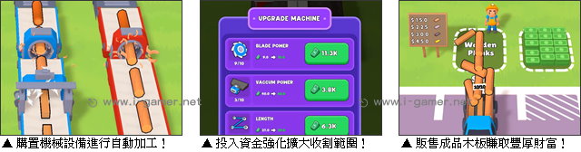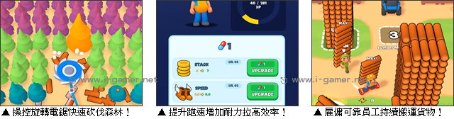 當邁著小短腿的主人公坐上車之後,就能利用銳利的鋸片砍下不同種類的樹木,並轉化為成堆的木材。但這還不是結束,玩家得更換成巨大吸頭,才能把原木通通運送到後方堆放處。至於這些木頭要怎麼換成現金?