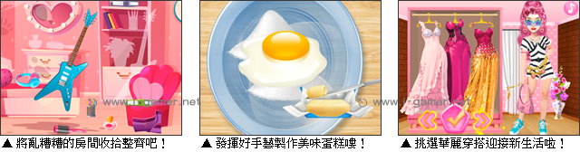 | 遊戲說明: 金髮女孩原本生活在精緻又夢幻的空間裡,每天都像被安排好一樣順利!但在某天,她突然發現,這樣的日子完全不真實,讓人感到空洞。於是,女孩決定鼓起勇氣,走進現實世界,開始一段屬於自己的新生活。  不過來到新公寓,迎接她的可不是什麼浪漫,而是亂七八糟的房間。她需要親力親為,將物品一一歸位才行。另外,為了招待即將到訪的客人,女孩還打算製作香噴噴的蛋糕,體驗屬於日常生活的小忙碌唷!而當一切就緒,當然少不了精心打扮的時刻。試著從她最喜歡的粉紅、金色與白色中搭配出亮眼造型,迎接全新的開始吧! 遊戲操作:以滑鼠操作進行遊戲,左鍵點擊道具整理房間、製作蛋糕、裝扮女孩。