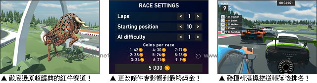 但如果覺得跑起來還是太難,玩家在開始比賽前也能調整該次的條件和難度。不過你會發現,當逐步下調圈數和難度後,該場能獲得的獎金也會大幅度下降……對於想要購買新車,或是解鎖美國橢圓賽場的玩家來說,也許不是個好消息喔!