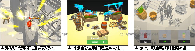 另外,當玩家輕觸那些關鍵物品,看著它們上色瞬間,也許會覺得神奇……但更神奇的,永遠在下一刻!只要將所有物品都找出,眼前的黑白灰世界,就會一下子拉開布紗一樣,變得亮麗迷人,充滿生命力啦!
