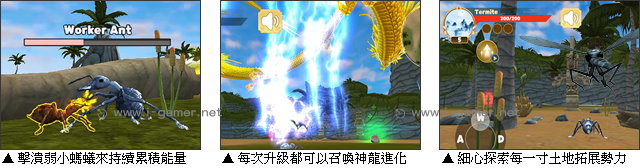 不過在牠獲得那些寶物之前,準蟻王還有個平凡的變強方法,那就是向跟牠同階或是較為弱小的夥伴發起攻擊——是的,只要成功擊殺目標,就可以吞噬牠們的屍體來累積能量!另外,當主人公充盈到足以進化時,就可以召喚金龍登場。牠帶來的絢麗特效可不只是炫耀,也能讓工蟻進階,甚至成為完全不同的形態呢!究竟在你的幫助下,牠的成王之路是否可以順利呢?快來試試吧!