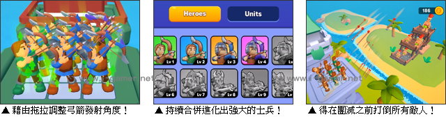 | 遊戲說明: 面對一波又一波入侵的敵人,你可以帶領弓箭手們牢牢守住城堡嗎?在《合併弓箭手》遊戲中,玩家需要藉由不斷花費金幣招募戰士,並將兩名完全相同的弓箭手融合,使他們進化成戰力爆表的進階版本。 隨著合併次數增加,射手們不僅外型會變得更帥氣,射出箭矢的傷害力也會直線上升,讓玩家能在愈加艱難的困境下生存下來。不過除了兵力養成,射擊技巧也是勝負的關鍵唷! 玩家得根據敵人的位置調整瞄準角度與力道,找到最棒的拋物線,讓從天而降的箭雨送對手回老家。而隨著你通過足夠多的關卡,玩家除了守住自己的領土,還能向外擴張……可愛的角色搭配豐富的內容,喜愛弓箭和合併玩法的玩家,千萬別錯過嘍!  遊戲操作:以滑鼠操作進行遊戲,左鍵拖曳調整射箭角度和力道。