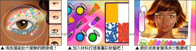 遊戲操作:以滑鼠操作進行遊戲,左鍵點擊道具製作眼影盤、為女孩化妝。