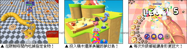 | 遊戲說明: 現在把你記憶中的貪食蛇玩法先擺一邊吧!在《限時貪食蛇》遊戲中,玩家將從一隻小可愛出發,藉由吃掉美味的食物來變得更加巨大,並在限制時間內,吞下指定的物品,以順利通過考驗。是的,限制時間,如果在計時歸零前,玩家沒能成功,那麼就只能說掰掰嘍! 不過這些食物有時候看得到,卻暫時吞不下。玩家得讓小蛇持續進食,才能一次次升級,變身擁有大嘴的巨型傢伙!另外,為了豐富遊戲樂趣,玩家勝利後還可以獲得積木,用來修復美麗的夢幻島唷!你能避開障礙、善用加速時機,成為島上體型最龐大、最長、也最強悍的不敗王者嗎?快來加入這場魔性滿分的的進食盛宴吧!  遊戲操作:以鍵盤 WASD 鍵或方向鍵或滑鼠拖曳操控小蛇移動。