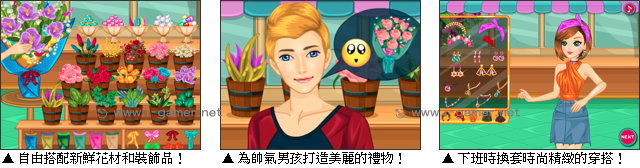 | 遊戲說明: 帥氣的男孩在經過花店時,對裡面正專注整理花材的女孩一見鍾情了!為了奪得女神的芳心,他決定走進店裡,告訴女孩他想要一束全世界最美麗的花,才能送給心儀的女孩並約她共進晚餐。  身為店員的女孩雖然搞不清楚狀態,但還是很有專業的!從嬌豔的玫瑰到清新百合,她幾經思考之後,拿上幾支後搭配亮眼的裝飾品,打造了一束飽含情意的絕美禮物。不過就在她換好下班穿搭,拉下店門後,抱著花束的男孩就這樣來到了身旁……究竟這份心意是否能順利傳達,贏得女神的甜蜜回應呢? 遊戲操作:以滑鼠操作進行遊戲,左鍵點擊道具製作花束、裝扮女孩。