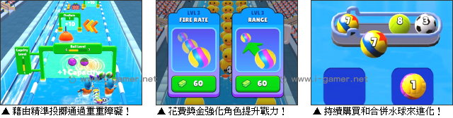 每次成功晉級,玩家都可以獲得一筆獎金,除了用來購買及合成同級水球提升火力,也能升級主角本身,讓他獲得全方面的進化!另外,除了基本的閘門玩法,部分關卡還會出現限時破門挑戰,玩家得在指定秒數內狂丟水球,越過守門員的阻擋,來取得額外分數喔!準備好一路合成、一路砸爆障礙,登上真正的水球王寶座了嗎?