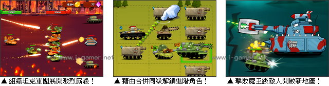 | 遊戲說明: 超好玩的《合併坦克戰》來啦!在遊戲中,玩家不需要有精湛的操作技巧,只要夠會合,就能奪下一勝又一勝。你將從最基礎的坦克開始,藉由把相同型號的一輛一輛拖在一起合併,來解鎖出火力更猛、外型更狂的鋼鐵怪物! 玩法走的是輕鬆的放置合併玩法,玩家只要持續收集、點擊、合成,就能打造專屬於你的坦克軍團。後排放可以遠程打擊的傢伙,前排則放近戰坦克,揮舞著銳利武器一頓輸出,將敵對車輛通通摧毀,就能向內陸推進嘍!不過想要開啟新地圖,玩家還得面對魔王級的巨大角色……它們擁有絕對的血量,只有足夠強的組合才能夠擊潰,玩家可要小心啦!  遊戲操作:以滑鼠操作進行遊戲,左鍵拖曳相同坦克合併、出戰。