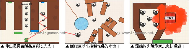 | 遊戲說明: 畫風超可愛的《飢餓的青蛙》是一款充滿創意與物理邏輯的益智遊戲。玩家需要幫助這隻身手矯健的青蛙,在數十個關卡中展現驚人的彈舌神技。是的!遊戲的核心就是伸出那又長又黏的舌頭,將滿天的蒼蠅通通吃光。 但別以為這只是簡單的點擊遊戲唷,玩家需要善用反射,才能在牆壁與障礙物之間移動,並且逮住躲在死角的獵物。另外,除了舌頭,利用道具可以讓效率更提升!例如觸碰巨球撞翻堆疊的木塊,或是引爆炸藥箱達成爽快通殺等等,都能在下一秒因為連鎖反應獲得滿滿成就感。準備好加入充滿驚喜的捕食之旅了嗎?快讓飢餓的青蛙吃得飽飽吧!  遊戲操作:以滑鼠操作進行遊戲,左鍵點擊發射舌頭。