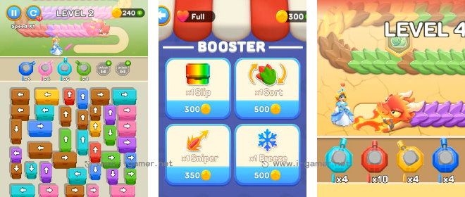 但要注意的是,平台上能安裝的位置有限,如果彈藥還沒發射完,砲台就無法被取下。而雪上加霜的是,下方待用的還標示了方向,玩家需要在確認該方向沒有阻礙的情況下,才能將它們拖出來喔!究竟在你的操控下,公主是否可以逃過被噴火龍芭比Q的命運呢?現在就來試試吧! |