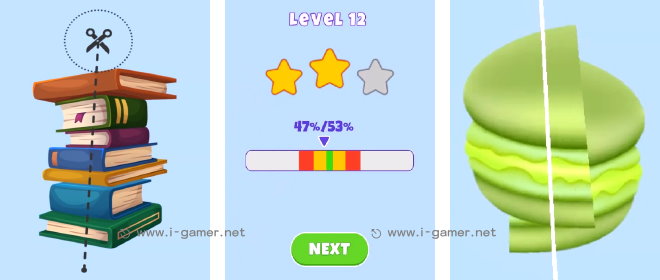 從一眼就能判斷,左右對稱的巧克力片、蘋果或是房子出發,後面玩家還要切割不規則形狀的,像是鞋子、椅子之類的。但如果成果判斷下來,離五五分太遠,玩家不僅拿不到滿分三顆星,甚至還可能需要重新來過喔!遊戲節奏不快,但認真玩起來也蠻燒腦的。想要短時間來點刺激挑戰的你,現在就來試試吧!