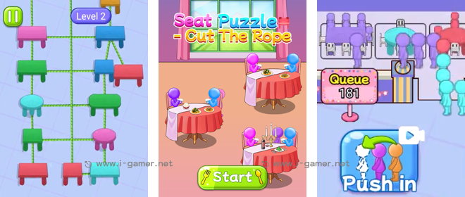 在遊戲中,等著享用大餐的小人已經在餐廳門口大排長龍啦!但有強迫症的他們卻超級挑剔,只願意坐對應顏色的桌子。此時玩家就得發揮你的觀察力,看要先喀擦哪條繩子,才能消化人群。