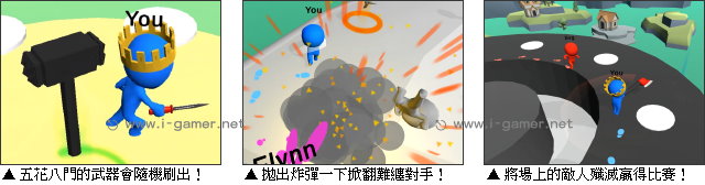 遊戲說明: 想當最後倖存者稱王嗎?那你得跑得快、砍得再狠一些唷!《奪寶大亂鬥》是一款超有趣的近戰大逃殺,玩家需要在偌大的競技場中,迅速搜尋隨機刷出的武器,並且在對手還來不及防備時給他致命的一擊,直到場上剩下你一人為止。 場上的武器五花八門,從炸彈、匕首到重型斧頭、十字弓一應俱全。每種攻擊方式和速度都不相同,玩家得靈活運用,才能克敵制勝!另外,隨著玩家通過考驗,地圖也會愈加變得複雜,有的需要靈活穿梭,有的則得持續攀爬,也考驗著你對環境的掌握唷!  遊戲操作:以鍵盤 WASD 鍵或方向鍵或滑鼠拖曳角色移動。