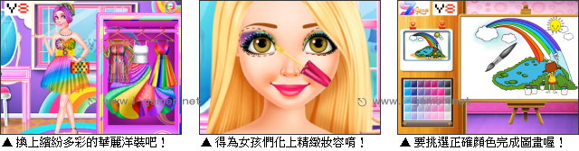 不過完美的造型可不只要求服裝,妝容也得配合!從眼影到唇色,每個細節都要相互呼應,才算成功駕馭唷!而更特別的是,在她們踏出沙龍前,還得利用繽紛的彩筆來完成可愛圖畫,才算結束這次的改造之旅呢! 遊戲操作:以滑鼠操作進行遊戲,點擊服裝、髮型、化妝品裝扮女孩們。