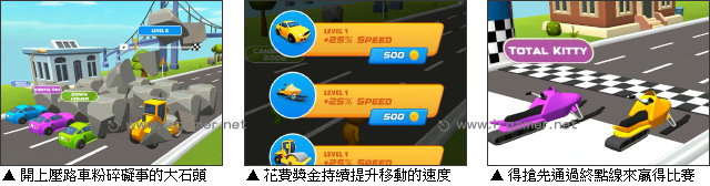遊戲說明: 面對變化萬千的地形,玩家能否順利穿越重重障礙,在一眾對手之中抱回冠軍獎盃呢?風格可愛又搞怪的《變身狂奔》是一款快節奏的變形競速遊戲。玩家在其中需要掌握時機,隨時變身成汽車、直升機、帆船、滑翔翼、雪地車等等不同的載具。不過這可不是單純的換皮唷!  每種交通工具都有特有的優勢。例如面對獨木橋時就得切換成腳踏車通過,遇到高聳石牆就要變成直升機才能爬升飛越。而在這之中,如果玩家的思考停滯,手速過慢,很可能下一秒就會被難纏的對手給追過啦!另外,除了變身玩法,遊戲還加入了建設元素。  玩家在比賽後將前往一座美麗的小鎮,你不僅可以用比賽獲得的獎金購置甜甜圈、冰淇淋店賺取額外的收入,還能解鎖修車行,為你的各項載具升級速度,讓它在賽事中表現得更加出色,拉大和對手的差距唷!準備好來一場熱血沸騰的奔跑了嗎?現在就動動手指,好好暖身一下,主角變形的速度與準確性,將是你通往勝利的關鍵唷!GO! 遊戲操作:以滑鼠操作進行遊戲,左鍵點擊載具圖案變身。