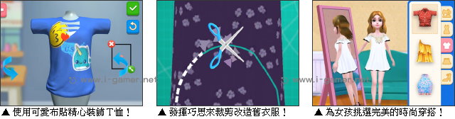 | 遊戲說明: 每個月都花費大量置裝費的女孩,總是覺得自己沒什麼衣服好穿!不過在她打開衣櫃之後,看著堆積如山的舊衣服,覺得問題說不定是出在自己身上呀!為了讓這些看起來過氣的舊愛再次成為新歡,女孩決定發揮她的手藝,好好改造一番!看是要讓洋裝變T恤,還是長裙變迷你裙,剪刀三兩下,就可以輕鬆搞定嘍! 不過有些衣服似乎就算改變了剪裁,看起來還是有幾分不足。這時候就要拿出之前累積的可愛布貼,精心裝飾一番,讓它變得別緻又獨特嘍!究竟在這一輪操作下,多出好些新衣能穿的她,最後可以打造出什麼樣的時尚造型呢?就讓我們好好期待一下吧!  遊戲操作:以滑鼠操作進行遊戲,左鍵點擊改造舊衣服、裝扮女孩。