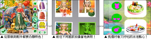 | 遊戲說明: 美艷的麗莎是位知名的旅遊網紅,她的夢想,就是用鏡頭記錄世界每一個充滿故事的角落。而在那天,看著外面的好天氣,她很快訂了機票,決定就此來場說走就走的時尚之旅。她選定的首站是泰國。看著灑滿陽光的古老寺廟,麗莎換上了絲質長裙,再搭配金色飾品,拍下了一張又一張優雅又莊嚴的照片。  而接下來,她來到奢華又禁忌的杜拜,選擇神秘感十足的長袍和頭巾,恣意享受一望無際的遼闊沙漠。鏡頭下的她十分高貴,彷彿是沙丘上的女王。最後,麗莎來到了馬爾地夫,海風輕拂,比基尼的清涼和美味的點心,絕對能拍出滿滿的度假感!究竟最後哪張照片會是麗莎的最愛呢?讓我們一起猜猜看吧! 遊戲操作:以滑鼠操作進行遊戲,左鍵點擊服裝、配件裝扮麗莎。