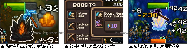 | 遊戲說明: 在這款像素風的《鑿礦挖寶小隊》點擊遊戲中,玩家需要帶領一支種族大融合的礦工小隊,不停敲擊礦石,直到閃閃發亮的水晶再次現世!聽起來簡單?那可不一定唷!因為每開一個新礦洞,材質就會變得更堅硬,只有不斷升級、擴編、合成,才能突破重重障礙,成為真正的礦工之王。 一開始,玩家只能依靠自己揮舞十字鎬,慢慢敲碎岩石,累積第一批晶石。這些晶石能用來雇傭可靠的夥伴,從笨拙的哥布林,到力大無窮的巨人,甚至還有呆愣的石頭怪、墮落的戰士,或是遠古的克蘇魯——每個角色都有自己的特性與採掘效率。 但要注意,每個礦區一次只能配置十名工人。如果位置滿了,玩家可以選擇讓相同角色合併,進階成更強的版本,也能直接解僱效率較低的成員,釋出空間給新夥伴。另外,在挖掘過程中,玩家還可能會隨機炸出珍貴的結晶。這些寶物可以前往商店販售,獲得更多晶石。  而之前提到的水晶,則是拿來啟動各種加速器的好東西,舉凡提升挖掘速度、自動挖掘等等,都可以讓你玩起來更輕鬆唷!你準備好體驗從孤身一人揮鎬出發,到後期率領十名、百名礦工全力開挖,那份從零開始、越挖越快的爽感了嗎?現在就動動手指,揮下第一鎬吧!  遊戲操作:以滑鼠操作進行遊戲,左鍵點擊挖掘、雇傭礦工。