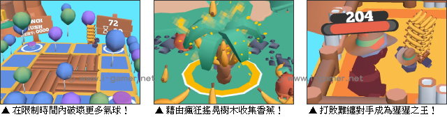 | 遊戲說明: 在熱帶群島深處,住著一隻對香蕉著迷的大猩猩!牠的夢想沒有別的,就是將全世界的香蕉都據為己有,成為真正的猩猩之王!而為了滿足這樣的夢想,玩家需要幫助這隻有點貪吃,又有點笨拙的猩猩,一路打爆擋路木箱、撿取香蕉,以在海島間建造橋樑,渡過危險的水域。  但這稱王之路可沒想像中簡單,討厭的螃蟹會時不時出來擋路,玩家可要讓猩猩見招拆招,將牠們通通打爆唷!另外,小島深處還有奇特的競技場。有時你需要在限制時間內與不知哪裡冒出來的氣球對抗,有時則得和前任猩猩王認真對打一波呢!現在就為猩猩戴上帥氣的帽子,正式踏上香蕉征戰吧! 遊戲操作:以鍵盤 WASD 鍵或方向鍵或滑鼠拖曳操控猩猩移動。