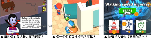 不過好消息是,只要玩家有努力搬,無論失敗與否,已經運上車的家具都能換成獎金。這些獎金就是你翻身的關鍵!你可以雇用新的幫手,雖然他們有些超可靠,但有些卻會躲起來睡覺!玩家還得變身監工,將他臭罵一頓喔!