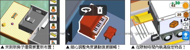 另外,在面對更大的豪宅時,玩家也可以升級移動速度、延長計時,或是使用提示綜觀全局,才不會被逼到爆走唷!而隨著玩家跟著滿載的卡車前往新家,完美服務的最後環節也登場了。你得發揮巧思,自由擺放家具,來替案主整理好每個空間,屆時才能開心的直接入住喔!準備好在混亂裡找規律、在搬家地獄裡找成就感了嗎?現在就繫好安全帶,坐上卡車出發嘍!