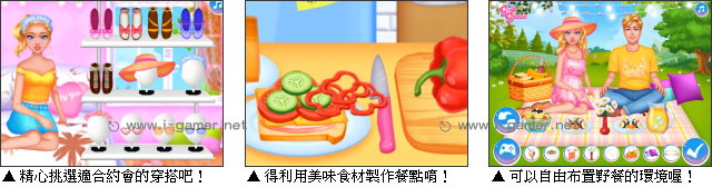 | 遊戲說明: 為了不浪費燦爛的陽光,潔絲決定和男友一起到公園進行野餐約會!不過在出發前,潔絲可有得忙了。為了讓野餐更加甜蜜,她希望能挑選兩人都喜歡的食材,製作成美味的三明治,並且把冰箱裡的水果和飲品通通帶上,打造一個讓人看了就食慾大開的野餐籃!  等到食物搞定,接下來就是穿搭啦!為了更符合野餐風格,潔絲決定穿得更加輕鬆一些。她將長髮弄得蓬鬆,換上甜美的洋裝,再搭配寬大的遮陽帽,是不是一下感覺就來了呢?究竟在約會正式開始後,潔絲男友對於她的這一些努力,能否給予滿滿的肯定呢?讓我們繼續看下去吧! 遊戲操作:以滑鼠操作進行遊戲,點擊道具準備食物、裝扮潔絲。